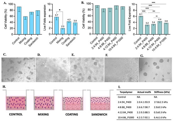 Cell viability assay of NIH-3T3 cells was performed with Live/Dead Viability Kit reagent as previously described [61]. In a 24-well plate, a number of 9500 cells suspended in regular medium was seeded per well. After 18 h of incubation, cell medium was removed, and cells were exposed to 700 µL of terpolymer solutions. Different concentrations (5, 10, 15, and 20 wt.%) of 2:4:94 P400 and 10:4:86 P1000 terpolymers were selected to verify cytotoxicity. After 24 h, the terpolymer solution in the wells was removed and washed twice with PBS. Regular cell culture medium was added to each well for 24 h to allow cells to recuperate before staining them with a Live/Dead Viability Kit. Cells were stained with calcein AM and ethidium homodimer-1. These stains can recognize viable or membrane-compromised cells by the binding of dye with nucleic acids. After 20 min of incubation, cells were recovered and transferred to 2 mL tubes for flow cytometer analysis using a BD Accuri C6 (BD Biosciences, NJ, USA) flow cytometer.