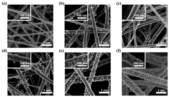 SEM images of the PAN-CuCl2 nanofiber with the different CuCl2 concentrations, (a) 0 wt%, (b) 2 wt%, (c) 4 wt%, (d) 6 wt%, (e) 8 wt%, and (f) 10 wt%, respectively. The insets are high-magnification SEM images of single nanofibers.