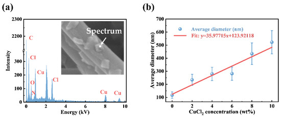 To confirm the particle composition on the nanofiber, the EDS point analysis was performed, as shown in Figure 2a. The characteristic peaks of Cl, Cu, C, N, and O are detected and confirmed on the spectrum, respectively. Figure 2b shows the nanofiber’s average diameter and standard deviation distribution with the different CuCl2 doping concentrations. With the increase in the CuCl2 concentration, the average diameter increases from 117 (±27) nm to 416 (±84) nm. At higher concentrations, the diameter increases rapidly. Simultaneously, higher CuCl2 concentrations lead to a wider diameter distribution.
