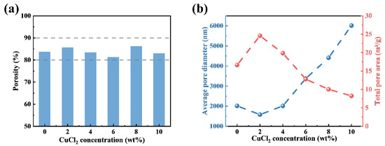 (a) Porosity of the PAN-CuCl2 electrospun composite nanofiber membranes with the different CuCl2 concentrations (0 wt%, 2 wt%, 4 wt%, 6 wt%, 8 wt%, and 10 wt%, respectively). (b) Average pore diameter and total pore area of the PAN-CuCl2 electrospun composite nanofiber membranes with the different CuCl2 concentrations (0 wt%, 2 wt%, 4 wt%, 6 wt%, 8 wt%, and 10 wt%, respectively).