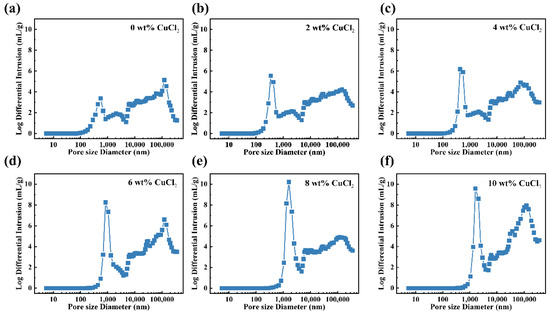 Pore size distribution of the PAN-CuCl2 electrospun composite nanofiber membranes with the different CuCl2 concentrations, (a) 0 wt%, (b) 2 wt%, (c) 4 wt%, (d) 6 wt%, (e) 8 wt%, and (f) 10 wt%, respectively.