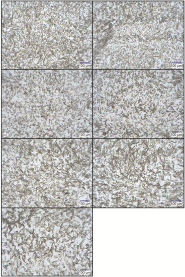 Optical micrographs of tensile test specimens’ cross-sections of samples: (a) D_0.5-3; (b) D_0.9-5; (c) D_1.7-5; (d) D_1.7-10; (e) V_2.4-5; (f) L_2.5-5; (g) G_3.3-5.