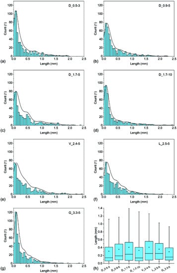 Fibre length distribution representations in Charpy impact test specimens of samples: (a) D_0.5-3; (b) D_0.9-5; (c) D_1.7-5; (d) D_1.7-10; (e) V_2.4-5; (f) L_2.5-5; (g) G_3.3-5; and (h) comparison of all samples.