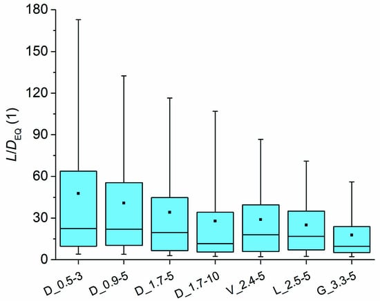 The fibre aspect ratio of the composites was estimated by dividing the measured fibre length (L) by the DEQ value. The estimated aspect ratio (L/DEQ) distributions of the fibres in the composites are presented in Figure 3. Sample D_0.5-3 contained fibres with the highest aspect ratio with upper quartile, mean, median, and lower quartile values of 64, 48, 22, and 10, respectively, despite the fibres having the lowest length among the cylindrical fibres. Sample D_0.9-5 contained fibres of lower upper quartile (55) and mean (41) values of aspect ratio, while the median and lower quartile values were approximately in the same range. Sample D_1.7-5 contained fibres with a significantly lower aspect ratio with upper quartile, mean, median, and lower quartile values of 45, 34, 20, and 7, respectively. Sample D_1.7-10, which was produced using fibres with the highest initial aspect ratio (838), had fibres with the lowest aspect ratio among the composites containing cylindrical fibres, with upper quartile, mean, median, and lower quartile values of 34, 28, 12, and 5, respectively. Micrographs of the cross-sections of the tensile test specimens revealed that the non-cylindrical fibres were significantly damaged during processing and some portions of the fibres were split along their lengths, resulting in a smaller cross-section area. Therefore, it is assumed that the L/DEQ values of the non-cylindrical fibres were slightly underrepresented, especially for Galaxy® fibres. Nevertheless, the results should still provide some insight into the approximate aspect ratio of the fibres. Among the latter composites, sample V_2.4-5 contained fibres with the highest upper quartile (40), mean (29), and median (18) values of aspect ratio, while sample L_2.5-5 contained fibres with slightly higher lower quartile (7) but lower upper quartile (35), mean (25), and median (17) values of aspect ratio. Sample G_3.3_5 contained fibres with by far the lowest aspect ratio, with upper quartile, mean, median, and lower quartile values of 24, 18, 10, and 5, respectively.