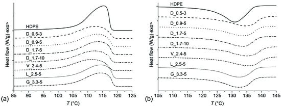 where ΔHm is the sample melting enthalpy, wPE is the mass fraction of HDPE and HDPE-g-MA in the sample, and ΔH0 is the melting enthalpy of 100% crystalline HDPE (293 J/g) [29].