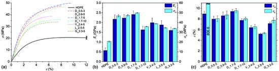 Tensile properties of samples: (a) stress–strain curves; (b) modulus and strength; (c) strain at break and strain at strength.