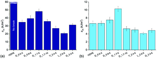 The Charpy impact strength of unnotched (acU) and notched (acN) specimens is presented in Figure 6a,b, respectively. The samples of neat HDPE did not break during the unnotched tests, while the acN was 6.6 kJ/m2. Sample D_1.7-5 exhibited the highest values of acU (48.2 kJ/m2) and acN (10.3 kJ/m2) among the composites, where the latter increased by 56% over neat HDPE. In comparison, sample D_0.9-5 exhibited lower acU and acN values of 39.3 kJ/m2 (−18%) and 7.5 kJ/m2 (−27%), respectively. The Charpy impact strength was even lower for samples D_0.5-3 and D_1.7-10, which exhibited similar values of acU (about 35 kJ/m2), whereas the acN of the former (6.7 kJ/m2) was higher than that of the latter (5.3 kJ/m2). The composites containing non-cylindrical fibres exhibited lower Charpy impact strength than samples containing cylindrical fibres. Sample G_3.3-5 exhibited the highest acU (31.3 kJ/m2) of the former composites, followed by samples V_2.4-5 (27.1 kJ/m2) and L_2.5-5 (20.7 kJ/m2). Samples V_2.4-5 and G_3.3-5 had acN values in the same range (about 5 kJ/m2), while the acN was lower (4.1 kJ/m2). In general, the Charpy impact strength of fibre-reinforced polymer composites depends on the same factors as σm but to varying degrees [35]. In our study, the acU of composites corresponded very well to εm and εb values (Pearson’s correlation coefficient (r) of 0.985 and 0.978, respectively), although with a slightly higher magnitude of effects.