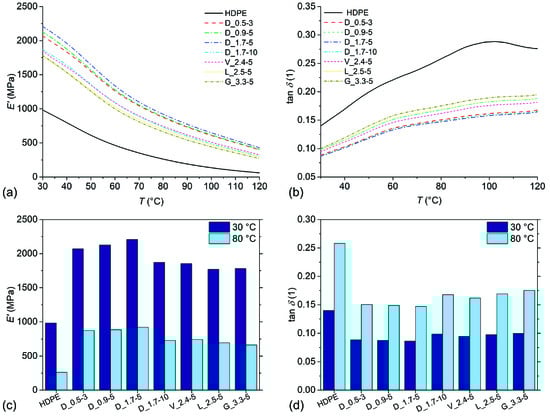 Dynamic mechanical properties of samples: (a) storage modulus E′ as a function of temperature; (b) loss factor tan δ as a function of temperature; (c) values of storage modulus E′ at 30 °C and 80 °C; (d) values of loss factor tan δ at 30 °C and 80 °C.