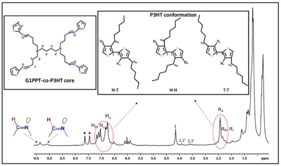 1H NMR of generation 1 poly(propylene thiophenoimine)-co-poly(3-hexylthiophene) [].