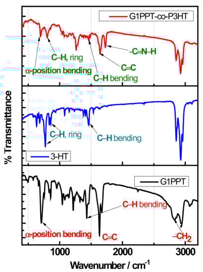 FTIR spectra of G1PPT-co-P3HT, 3-HT, and G1PPT [].