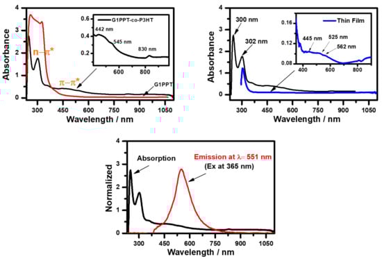 UV-Vis absorption spectra of G1PPT-co-P3HT and G1PPT in chloroform solution (top left), as thin film (top right) and photoluminescence spectrum (bottom) [].
