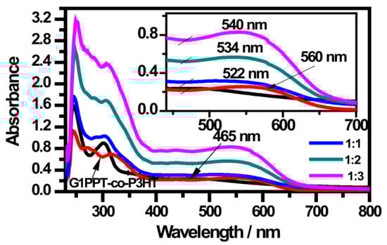 UV-Vis absorption of G1PPT-co-P3HT/PDI-co-Carbazole at different ratio [].