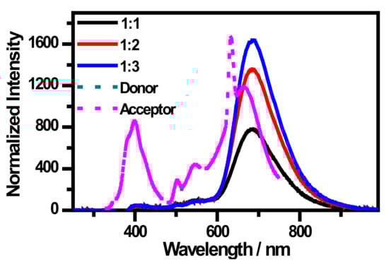 G1PPT-co-P3HT/PDI-co-Carbazole different bulk heterojunction blended photo-physical properties were also investigated using photoluminescence the spectroscopic technique. The nanocomposite fluorescence properties were studied. Fluorescence of pristine G1PPT-co-P3HT and PDI-co-Carbazole are presented in Figure 8 Upon excitation of D-A blends, total quenching of the donor is observed, characterized by the complete disappearance of the G1PPT-co-P3HT fluorescence emission peak initially exhibited by the pristine material at 551 nm, an indication that there is essentially no radiative exciton decay in the blend []. This can be as a result of the photo-induced electron transfer between the electron-donating G1PPT-co-P3HT and the electron-accepting, PDI-co-Carbazole which is the desired process in photovoltaic devices. Additionally, while a red shift (20 nm) in the emission peak of the blends is observed from 665 nm in pristine PDI-co-Carbazole to 685 nm in the blends, an increase in peak intensity with increasing content of PDI-co-carbazole can also be noted. The total disappearance of the donor fluorescence peak coupled to the increase in acceptor intensity peaks suggest that there is also a Fluorescence or Förster resonance energy transfer (FRET) from the donor to the acceptor []. This is further confirmed by the emission spectrum of the donor overlapping the acceptor absorption spectrum [] as shown in Figure 9. We also suspect that this energy transfer is followed by non-radiative recombination [] considering the increase in acceptor peak intensity as mentioned above.