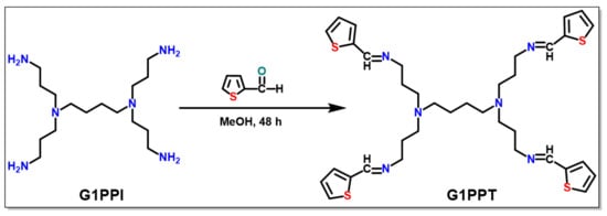 Functionalization of generation 1 poly(propyleneimine) tetramine dendrimer [] (0.3863 g) using 472.55 µL (4.8821 mmol) of thiophene carbaldehyde in 25 mL methanol under N2 stream for 48 h that produces generation 1 poly(propylene thiophenoimine), G1PPT (Scheme 1) was confirmed by 1HNMR spectroscopy analysis (400 MHz) in CDCl3. The chemical shifts were compared to those found in the starting materials, generation 1 poly(propyleneimine) tetramine, G1PPI and 2-thiophene carbaldehyde (Figure S1). G1PPI was characterized by the following chemical shifts δ (ppm) 2.68–2.64 (t, 4H), 2.41–2.32 (2t, 16H), 1.57–1.49 (m, 12 H) and 1.33 (s, 8H) (Figure S1, Supplementary Materials). On the other hand, 2-thiophene carbaldehyde had three (3) main bands at 9.92 (s, H), 7.77–7.74 (m, 2H), and 7.25–7.18 (m, 1H) (Figure S2, Supplementary Materials). G1PPT showed a combination of the bands found in both starting materials with the difference being that the chemical shifts of the protons in the functionalized dendritic moiety are deshielded by the attachment of the thiophene ring and the formation of an imine group −N=CH, whose proton appears at 8.31 ppm. Furthermore, formation of this new bond results in a shielding effect of the thiophene protons-b and -d. Initially appearing as multiplet in 2-thiophene carbaldehyde, they have been split due to cis-trans conformation, with proton-d appearing more downfield than proton-b (Figure S3, Supplementary Materials).