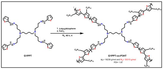 Copolymerization of G1PPT to 3-HT followed the procedure reported by Liu et al. [] for the polymerization of 3-hexylthiophene (Scheme 2). Specifically, 77.8 mg of G1PPT and 291 mg of FeCl3 were put in a 2-neck round bottom flask containing chloroform (CHCl3). 3-hexylthiophene (81 µL) was added dropwise to the magnetically stirred suspension and the reaction mixture was stirred for 48 h in an N2 atmosphere. 100 mL of methanol was added to quench the copolymerization. The prepared material was successively extracted with methanol (100 mL), acetone (100 mL), and CHCl3 (100 mL) by column chromatography and filtration, and G1PPT-co-P3HT copolymer was collected from CHCl3. Number of average molecular weight, Mn, and dispersity, PDI values were estimated from size exclusion chromatography, performed using HPLC grade dimethylformide (DMF) at a flow rate of 0.8 mL/min. Mn was found to be 16,239 g/mol and the average molecular weight, Mw 30,315 g/mol. The dispersity, PDI = Mw/Mn is calculated to be 1.87.