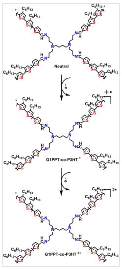 Two-step redox process of G1PPT-co-P3HT|Au electrode in in 0.1 Bu4NPF6 in acetonitrile [].