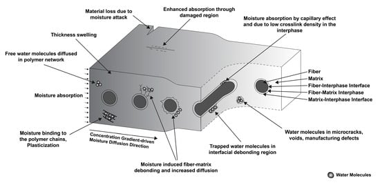 In essence, the water molecules inside composite materials can remain in two different forms—free or bound. Free water molecules remain in the polymer matrix between cracks, voids, or manufacturing defects. The fiber–matrix interfacial region can also hold free water molecules. These trapped water molecules can eventually be released if the desorption conditions are met for the composite []. However, bound water molecules are chemically trapped in the matrix. In FRP composites, the matrix consists of a resin (i.e., epoxy, etc.), hardener (i.e., diamine, etc.), and other chemical constituents, depending on the manufacturer []. These chemical compounds primarily consist of, or can react to, hydrophilic hydroxyl groups (-OH) or amine groups (-NH2), which attract polar water molecules and create a hydrogen bond to trap the water molecules in the matrix []. Typically, in FRP composites, the absorbed moisture amount is meager. Still, the corresponding adverse effects are significant enough to cause different reversible and irreversible chemical changes, such as hydrolysis, chain scission, oxidation, plasticization, micro-crack development, interfacial debonding, etc. []. With desorption, the bound water molecules may or may not reside in the matrix, but decreased mechanical properties cannot be restored fully []. Different absorption mechanisms contribute to the overall absorption scenario, including diffusion, capillary effect, absorption through microcracks, manufacturing defects, fiber–matrix interface, etc. Figure 1 shows the different moisture absorption mechanisms evident in FRP composites.