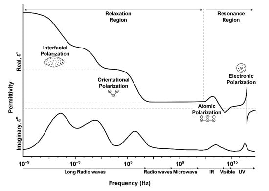 With technology advancements, different NDT methods are being introduced that focus on a different aspect of the material’s behavior to detect and monitor damages and contribute towards a predictive maintenance approach [,]. Impedance/dielectric spectroscopy is an NDE method that has been used in numerous sectors of structural health monitoring, including material state characterization [,], polymer cure monitoring [], prepreg degradation [,], adhesive bonds [,], damage detection [], etc. Broadband dielectric spectroscopy (BbDS) is another practical approach for studying the interaction of electromagnetic waves with materials at frequencies spanning from 10−6 to 1012 Hz. In the form of various dielectric characteristics of the material under investigation, this dynamic range can give information regarding molecular and dipolar perturbations, as well as charge transport and polarization effects, as described in Figure 2. As water molecules are dipoles in nature and create hydrogen bonds with the matrix component’s hydrophilic groups, they alter the composite’s dielectric properties by imposing different polarizations. This behavior can be detected, in terms of minute changes in dielectric properties, using IS/BbDS.