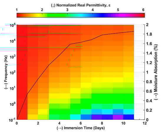 Heatmap of normalized real permittivity and trend of moisture absorption with immersion time [].