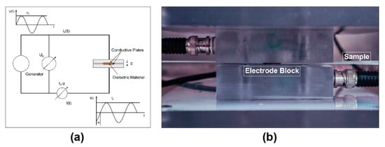 (a). Schematic of a sample placement between the electrodes in BbDS equipment []. (b). Experimental setup for BbDS.