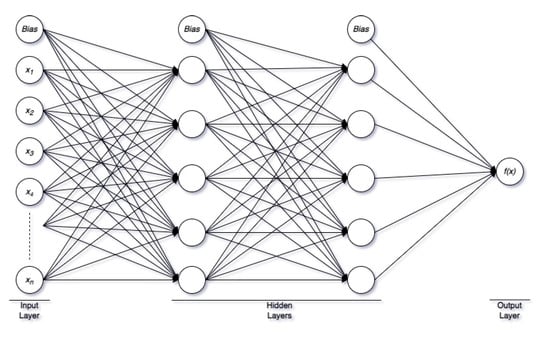 In this work, a fully connected, feed-forward artificial neural network (ANN), named multilayer perceptron (MLP) model, has been developed for classification and regression studies to predict the current moisture state in the composite. MLP is a supervised learning algorithm with at least three sequential layers, i.e., the input layer, hidden layer, and output layer. Each layer provides a set of output vectors that work as the input vector of the next layer. Figure 5 shows a simple MLP structure. The input layer consists of the raw input data with n features (also known as neurons/nodes).