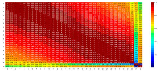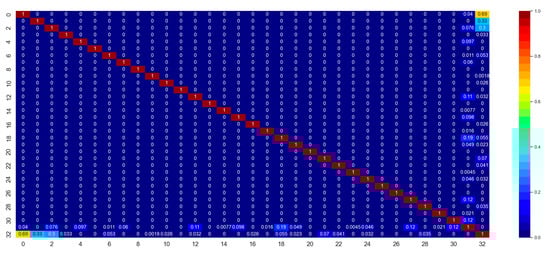 The first important thing to develop a machine learning model is to understand the dataset and feature characteristics. Figure 8 shows the correlation matrix of the features and the label for the classification dataset. Correlation is a statistical parameter that represents to which extent multiple variables fluctuate in tandem []. A high correlation between the independent and dependent variables implies that the independent variable has high significance in governing the output. However, a high correlation between two different independent variables implies that the two variables are redundant, which is undesired in ML model development. This leads to computational inefficiency and memory wastage. Here, columns indexed by from 0 to 31 are the features, and the column with index 32 contains the labels. From Figure 8, it can be seen that the correlation between the features and labels are high enough (>0.5), from a statistics point of view. However, the thickness feature (index 31) is not very well-correlated (0.011 < 0.5) with the data labels. This means, unlike the dielectric permittivity features, the thickness feature does not affect the output labels significantly.