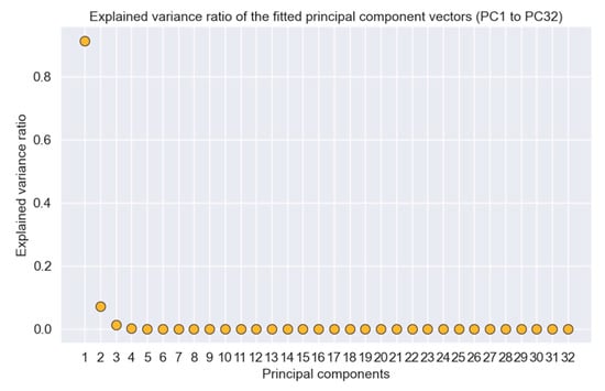 Explained variance ratio for 32 principal components.