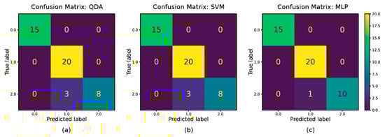 Confusion matrices for (a). QDA (with PCA), (b). SVM, and (c). MLP classifiers.
