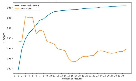 Multiple linear regression (MLR) has no hyperparameters to tune. However, the output can vary, depending on how many features it uses. For example, a feature that has no correlation with the output can actually do more harm to the model, rather than developing it. So, the recursive feature elimination (RFE) technique was adapted to find which features in the training folds were most effective in predicting the target. At first, RFE fits the MLR model with all of the features and ranks the importance of the features. In the next step, RFE discards the least important features and re-fits the model to evaluate the performance. This step is performed until a desired number of features is reached. In this work, RFE was performed to fit and test the MLR model, with 1–32 features in different subsets. The results are shown in Figure 12. The figure shows that using only the first three important features gives the best performance of the model. The first three important features are real permittivity values at 542 Hz, 339 Hz, and 1390 Hz. If the MLR model is developed using the real permittivity values at these frequencies, the coefficient of determination R2 of the predicted and true test data is 0.9511.