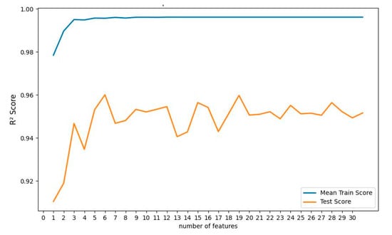 The decision tree regressor (DTR) model has also been developed using 10-Fold cross-validation and the RFE technique. The maximum depth of the tree was nine, and the mean squared error (MSE) function was selected to measure the quality of the split in the internal nodes. MSE function minimizes the L2 loss using the mean of each terminal node. These hyperparameters were obtained using the grid search technique. Figure 13 shows the R2 score for the RFE analysis of the DTR model. It can be seen that the maximum R2 value (0.9605) achieved from the DTR model was when the first six most important features were selected to develop the model. The corresponding features include real permittivity values at 212 Hz, 2 Hz, 52 Hz, 827 Hz, 1388 Hz, and DRS values. However, using all the features does not harm the model output as severely as in the case of MLR. If all 32 of the features are used to develop the model, the R2 value of the model on the test data is 0.9544, which is very close to the maximum obtained R2 value of 0.9605.