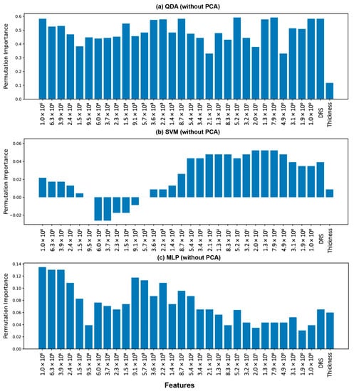 Permutation importance (PI) values for features used in developing (a). QDA, (b). SVM, and (c). MLP, without PCA.