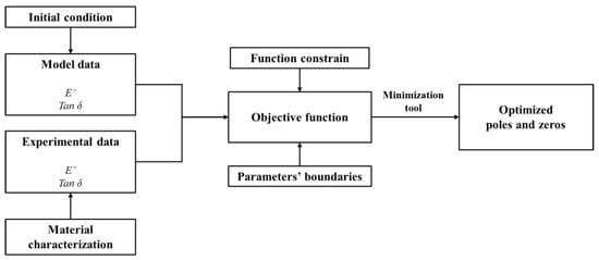 where and are the zeros and poles, respectively. The presented approach, consisting of a superposition of poles–zeros coupled behavior, overcomes the computational and convergence issues typically occurring in the parameterization of the rheological models in the time and frequency domain forms since it enables the determination of boundary conditions and initial starting guess for the optimization problem [23]. Figure 2 schematizes the main phases of the adopted constrained nonlinear optimization procedure aiming at identifying a robust set of poles–zeros coefficients, starting from a feasible set of initial conditions, detailed by the authors in [2].