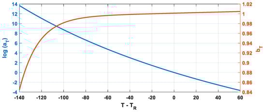 As observed in [26,27], the frequency–temperature superposition is valid due to the fact that various relaxation times belonging to a given relaxation process have the same temperature dependence. This principle relates the material response at a given time t (or frequency ω), and at a given temperature T, to that at other conditions (denoted by subscript r):