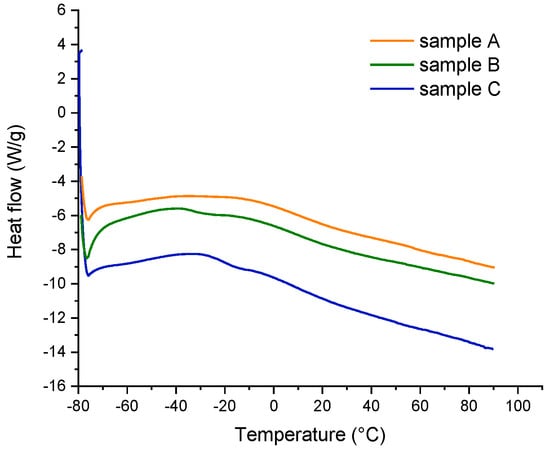 All the samples exhibited a weak glass transition temperature around 9 °C, while only samples B and C showed an intense transition at −33 and −20 °C, respectively.