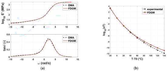To quantify the accuracy of the FDGM approach, the NRMSE is also evaluated, both for the storage modulus and for the loss tangent quantities defined in Equations (12) and (13). The purpose of these indicators is to quantify the goodness of the models’ behavior toward the experimental data reproduction. Table 2, in addition to the NRMSE, reports the identified coefficients C1 and C2 of the WLF law (10).
