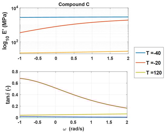 In [2], it has been demonstrated that an excellent prediction of the master curves can be achieved by adopting data coming from the lower and upper frequencies plateau of the storage modulus, the peak of the loss tangent curve, and the curvature change of both curves. Moreover, satisfying results can also be obtained by considering only the data available of the upper and low-frequency plateaus plus those at the loss tangent peak. Borrowing these results, three isotherms have been chosen for the analysis: an isotherm at high temperature, an isotherm at low temperature, and one that presents the maximum value of tan δ. For explanatory purposes, Figure 10 reports the experimental starting set for the identification of compound C.