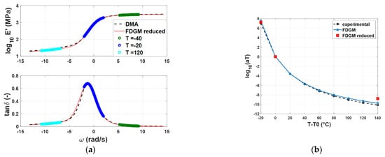 The parameters of the three-element FDGM and of the WLF law have been identified, and the models’ results have been compared with the experimental results in the entire frequency range. Figure 11 depicts the curve comparisons for compound C: Figure 11a shows the master curves estimated (FDGM reduced) compared with the full experimental DMA. Furthermore, in the same figure, the partial experimental data used for the identification are highlighted in the frequency domain. Figure 11b shows the experimental WLF law in comparison with the identified value of the FDGM by adopting both all and partial experimental data. These results highlight how the proposed technique is able to give a good estimation of the master curves and the time–temperature superposition parameters, while also using a reduced dataset of experimental data. To quantify the approximation in the latter case, the NRMSE has been calculated in the entire frequency range and for the three compounds. The results are reported in Table 3, where it is possible to note that the NRMSE < 0.06 in all cases. Some differences can be found in the estimation of parameters C1 and C2; however, this difference implies a small difference in the calculation of aT in the temperature range exanimated, as shown in Figure 12a,b.
