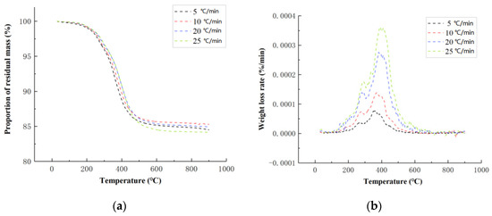 The TGA test was carried out using a TGA 4000 (PerkinElmer, Waltham, Massachusetts, USA) instrument. The test was carried out in a dry flow rate of 100 mL/min nitrogen atmosphere. Samples of 5–10 mg were taken for each test, and the heating rates were set at 5, 10, 20, and 25 K/min. The temperature range of the test was from room temperature to 900 °C.