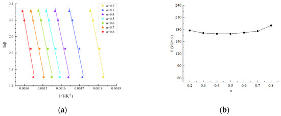 Results at different conversion rates based on the Flynn–Wall–Ozawa method: (a) linear fitting curves; (b) activation energy results.