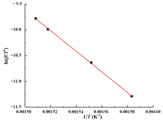 The peak temperature (Tpi) of the DTG curve is the same as Table 1, and the fitting curve is shown in Figure 5. According to Formula (8), for ln(β/T2) and 1/T, as shown in Figure 5, the activation energy is 166.79 kJ/mol at the maximum thermal decomposition rate of peak temperature (Tpi). The calculated results are not much different from those obtained by the Flynn–Wall–Ozawa method, 168.76 kJ/mol.