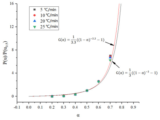 A series of experimental data points can be obtained by substituting the activation energy E and temperature T obtained at different conversion rates (Figure 4) into the left end of Equation (13). The experimental data points at different heating rates are given in Figure 4, and it can be seen that the data points at the four heating rates almost all overlap, indicating that the thermal weight loss process of the carbon fiber composite core follows a single reaction mechanism function. The trend of these data with the conversion rate coincides with the reaction mechanism function assumed in Equation (7), i.e., it follows f(α) = (1 − α)n and G(α) = ((1 − α)−n − 1)/n. As shown in Figure 6, the best fit to the experimental data was found after several correction calculations when n = 3.3, and thus the reaction mechanism function of the carbon fiber composite core was determined as G(α) = ((1 − α)−3.3 − 1)/3.3.