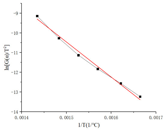 The Coast–Redfern method [43] was used to incorporate the obtained reaction mechanism function, and the pre-exponential factor A was obtained from the curve fitting to obtain the following equation: