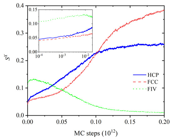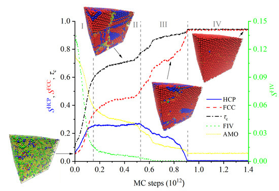 In Region I, starting from the initial amorphous configuration, a rapidly growing number of monomers spontaneously develop crystalline characters, as evidenced by the steep drop in the AMO curve and the simultaneous growth of the number of FCC and HCP sites. As a matter of fact, of all sites already have definite HCP or FCC character, and show FIV character in the very first frame ( MC steps). This is the reason for the curves in Figure 1 and Figure 2 apparently not starting at 0 (HCP, FCC, and FIV) or 1 (AMO), and is a consequence of the great length of the calculation: alone in the first frame, MC moves have been carried out, on average, for each of the monomers. These observations are also qualitatively consistent with past simulations of dense random packings of monomers [49,50] and polymers [91,104,105], where the population of fivefold sites can exceed the sum of sites with HCP or FCC character.