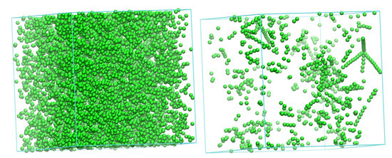Initially, FIV sites appear abundantly and are randomly distributed in the simulation cell, but as their population subsequently decreases, they develop a remarkably non-homogeneous distribution in space. The left panel of Figure 4 shows this spatial distribution of sites with FIV symmetry at a configuration within Region I (frame 125). At this stage, most of the numerous FIV sites () are still isolated, although the first traces of the linear assemblies of FIV sites are already visible. At a later stage of the simulation (frame 1622, early in Region II), as can be seen in the right panel of Figure 4, the FIV population is significantly lower () and the majority is organized in specific geometric patterns that are entirely analogous to those observed in the past [108,109].