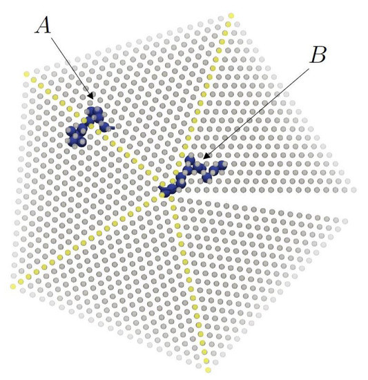 The mechanism of the disappearance of linear FIV assemblies in crystals of polymers is not just due to fluctuations brought about by the localized rearrangements of sites, as is the case in systems of monomeric hard spheres. In the case of chain molecules, the cyclic pentatwin incurs an extra entropic penalty with respect to the untwinned HCP or FCC crystals, because its sites are not individual spheres, but monomers of a polymeric chain. There exists an entropic penalty for chains in a cyclic pentatwin caused by the reduced number of available chain conformations with respect to those in a untwinned crystal. In the pentatwin, some chains are forced to span the boundaries between sectors (marked with “A” in Figure 6), or to occupy sites in the twinning axis (the linear FIV assembly, perpendicular to the plane of the paper marked with “B” in Figure 6). These two geometric situations force some of the torsional angles along the chain to adopt highly improbable values, which entails a decrease in entropy.