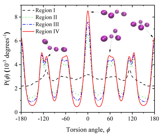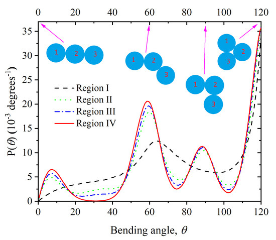 Probability distribution function of bending angles averaged over Regions I through IV. Values of are forbidden, due to an overlap of monomers 1–3. Three-site arrangements that correspond to specific bending angles are sketched as indicated by the arrows. The following color and style format is used throughout the manuscript: Region I (dashed black); Region II (dotted green); Region III (dashed-dotted blue); Region IV (solid red).