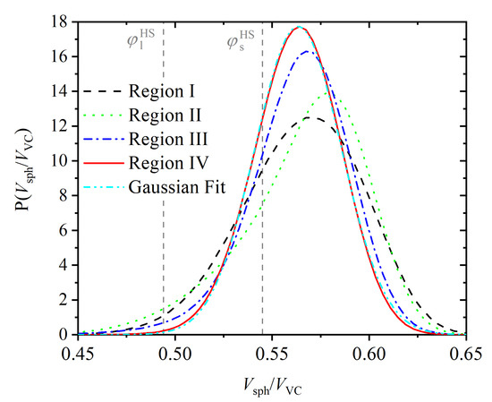 The increase in the regularity of the volume available to the monomers as the crystal is formed can be observed in Figure 10. This figure shows the probability distribution of the local density (measured as the ratio of the volume of a monomer () to the volume of its Voronoi cell () for Regions I through IV. Since the ensemble is isochoric, the curves in Figure 10 have the same mean value, but their shapes and variances do change in the course of the simulation. The wider initial distribution reflects the greater abundance of monomers with either low or high local volume fraction (i.e., high or low volume of their Voronoi cell), while the narrower distribution in Region IV highlights the greater spatial homogeneity (in the sense of the distribution having smaller variance) of the volume of the Voronoi cells in the FCC state. The distribution in Region IV (crystal) follows a Gaussian distribution almost perfectly (dashed line in Figure 10), which is consistent with the fluctuations of the monomers about the sites of an FCC crystal [116,117]. For reference purposes, the local volume fractions of the liquid and solid phases of the monomeric HS fluid at equilibrium are and times the maximum close packed density (0.7405), i.e., and , respectively [42,118] (marked with vertical lines in Figure 10).