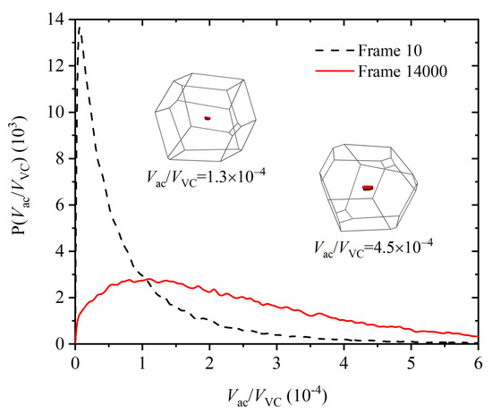The shape of the accessible volume is a smaller version of the Voronoi polyhedron, but with slightly rounded vertices, and whose faces are parallel to the faces of the Voronoi polyhedron. The logarithm of its size gives, to first order [120,121,122], a quantitative measure of the translational entropy of the monomer, under the neglection of multibody correlation and conformational entropy; that is, ignoring the fact that it belongs to a polymeric chain. Figure 11 shows a typical Voronoi cell as a wireframe representation, and the accessible volume as the red solid shape within the Voronoi cell. Unlike the total system volume V, the total accessible volume is not conserved and is very sensitively related to changes in translational entropy. Figure 12 shows the distribution of the accessible volume for all monomers, in the initial amorphous state at the beginning of the MC calculation, early in Region I and in the last frame of Region IV, i.e., when the FCC polymorph has fully developed. The distribution of accessible volume becomes clearly narrower, and its mean value shifts to the right. The mean relative accessible volume almost triples from to as the system crystallizes. The whole distribution shows this increase vividly (Figure 12), and is direct evidence that, by adopting a spatially more homogeneous and geometrically more isotropic arrangement in the crystal, monomers increase their translational freedom, and hence, the system entropy. This is the main driving force for the crystallization of the chains, just as in a system of monomeric hard spheres.
