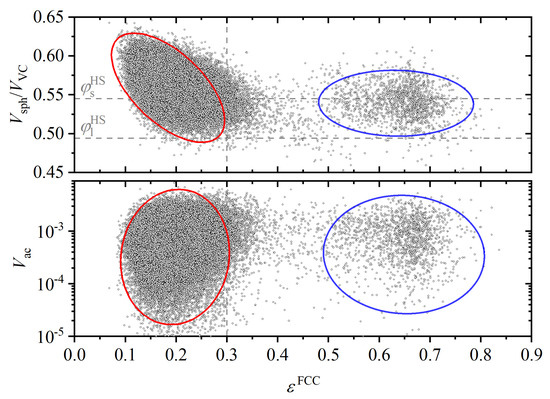 Parity plot of local volume fraction (upper panel) and accessible volume (bottom panel) at frame 14,000 in Region IV vs. the corresponding FCC-CCE norm, . Red ellipse denotes FCC sites. Blue ellipse corresponds to non-FCC sites. Horizontal dashed lines in the upper panel mark the volume fractions of the liquid and solid phases of the monomeric HS fluid at equilibrium, i.e., and , respectively. The vertical dashed line denotes the CCE-norm threshold .