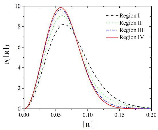 Distribution of the modulus of the vector joining the position of a given monomer and the centroid of its Voronoi cell, , for the four different regions.